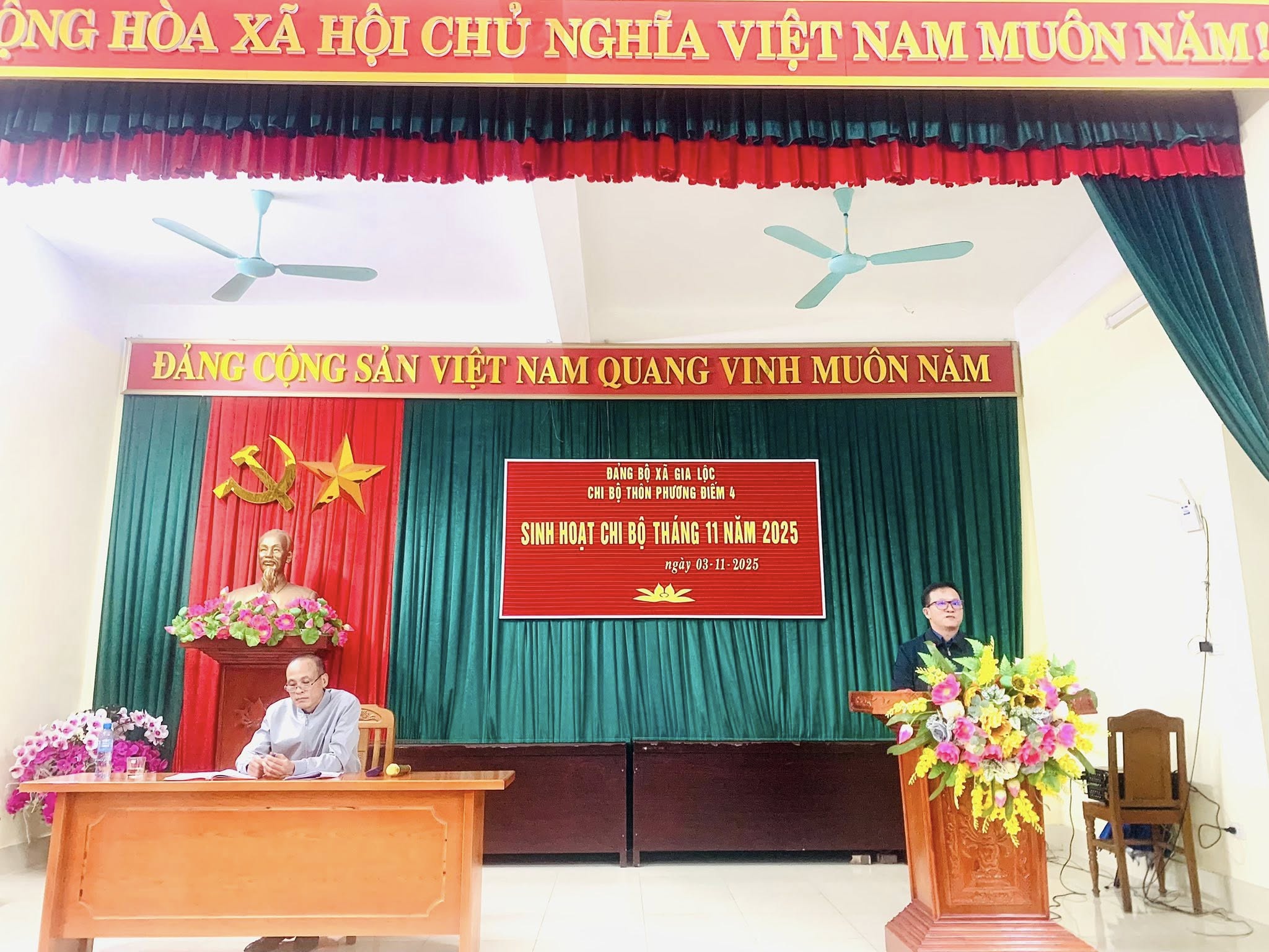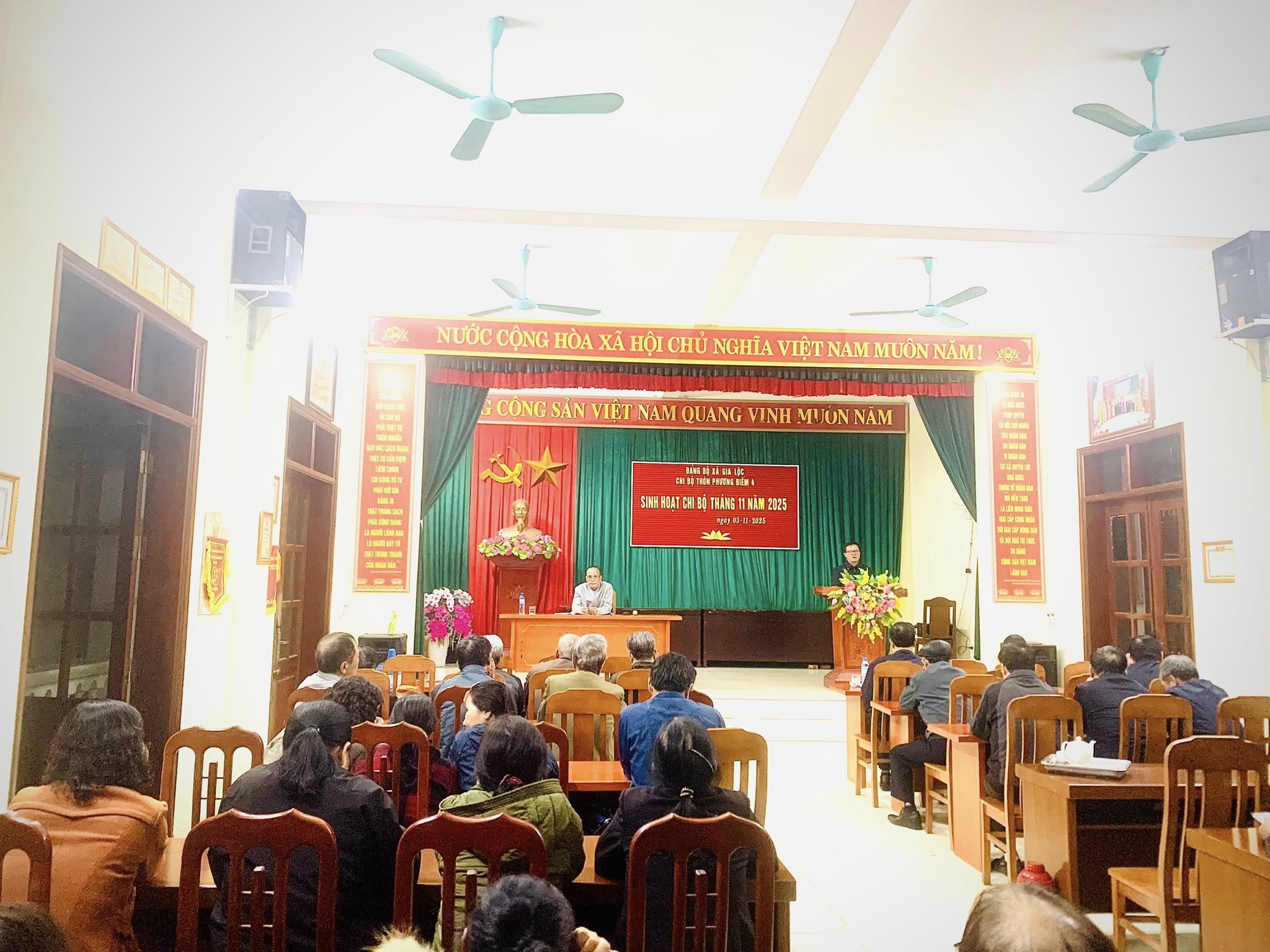 Thực hiện chương trình công tác quý IV buổi tối ngày 03/11, Chi bộ Thôn Phương Điếm 4 tổ chức buổi sinh hoạt chi bộ định kỳ tháng 11 năm 2025. Buổi sinh hoạt lần này đặc biệt ý nghĩa khi có sự tham dự của đồng chí Đỗ Văn Sáng - Phó Bí thư Thường trực Đảng ủy cùng các đồng chí Ủy viên Ban Chấp hành Đảng ủy xã. Đây là dịp để toàn thể Đảng viên trong chi bộ thống nhất tư tưởng, nâng cao chất lượng lãnh đạo và cụ thể hóa các nhiệm vụ chính trị tại cơ sở.