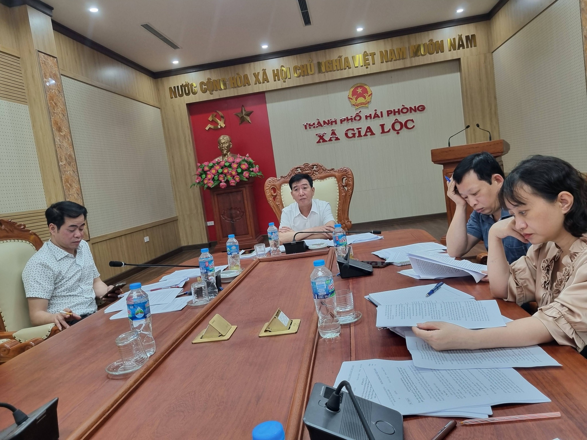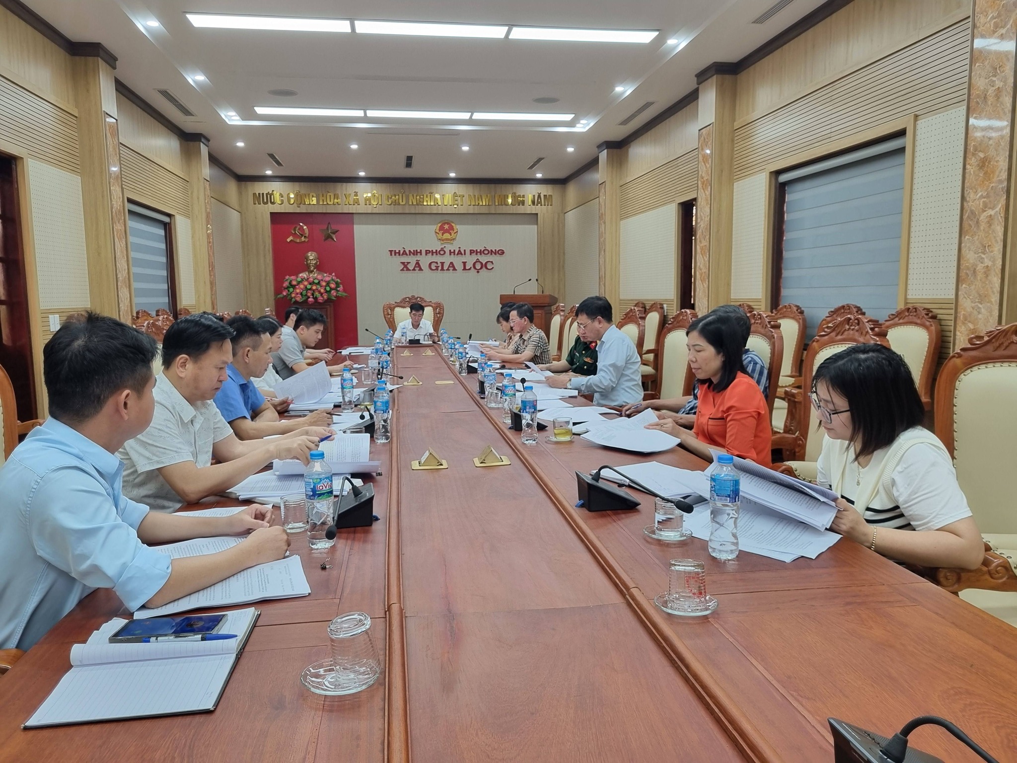 Đồng chí Phạm Văn Thung - Chủ tịch UBND xã chủ trì cuộc họp. Tham dự có các đồng chí Phó Chủ tịch UBND xã; đại diện lãnh đạo HĐND xã; các Ủy viên UBND xã; lãnh đạo, chuyên viên Văn phòng HĐND và UBND xã. Ngoài ra, còn có sự tham gia của lãnh đạo Phòng Kinh tế xã, các ban HĐND xã, Ủy ban MTTQ xã, Trung tâm dịch vụ sự nghiệp công, Xí nghiệp khai thác công trình thủy lợi Gia Lộc cùng các đơn vị liên quan.