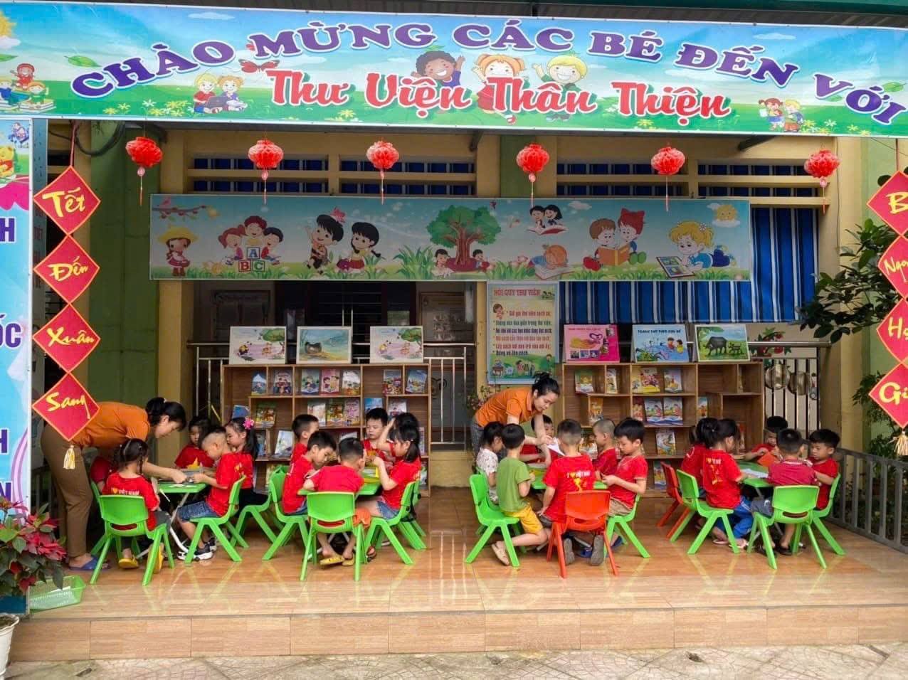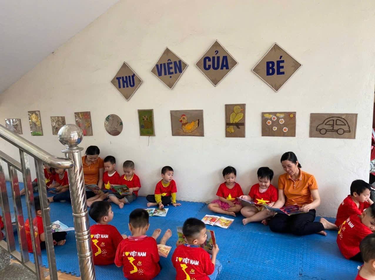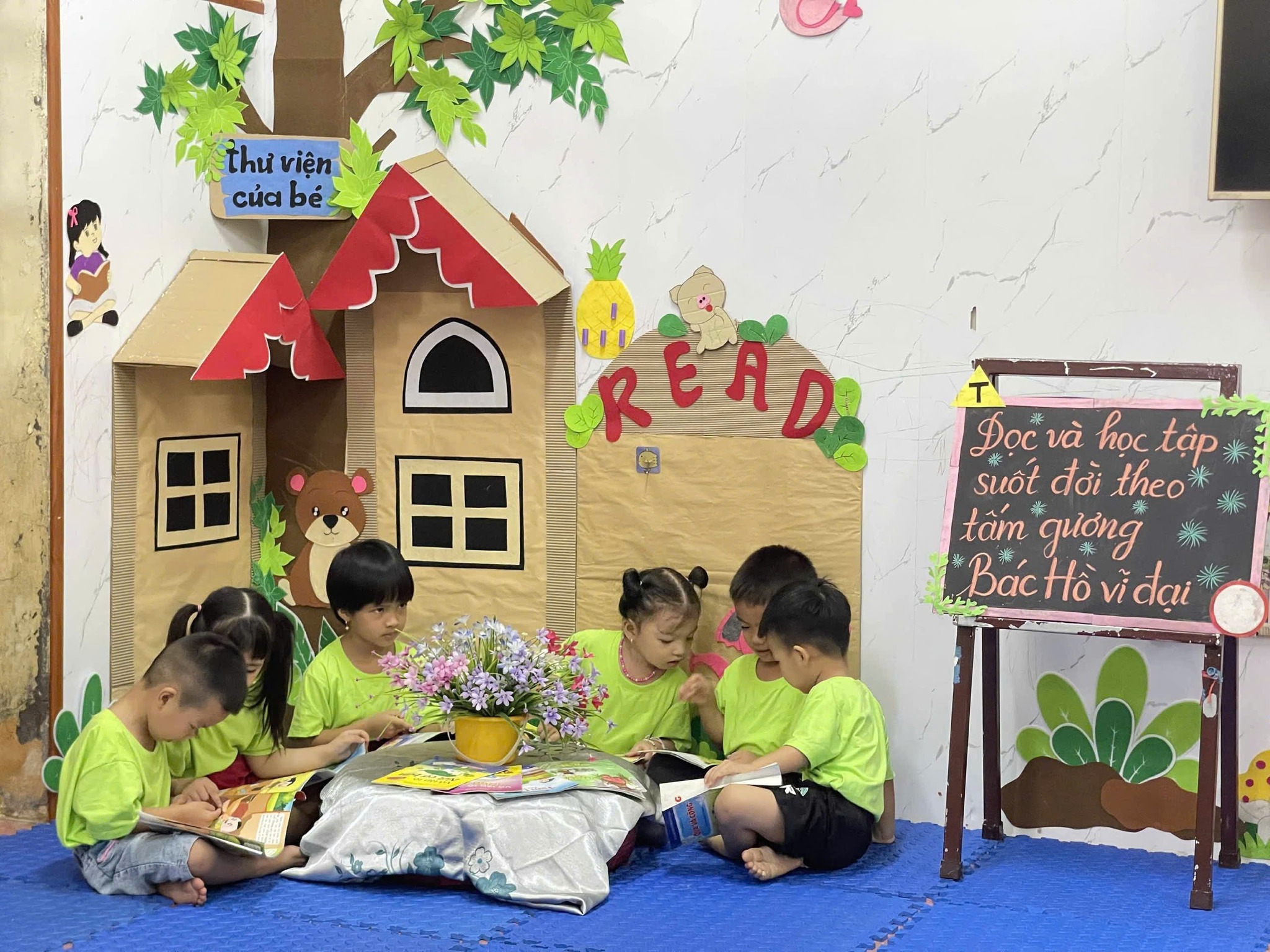 Xây dựng “Góc thư viện thân thiện” trong lớp học, khuyến khích trẻ khám phá tri thức qua tranh ảnh và truyện thiếu nhi.