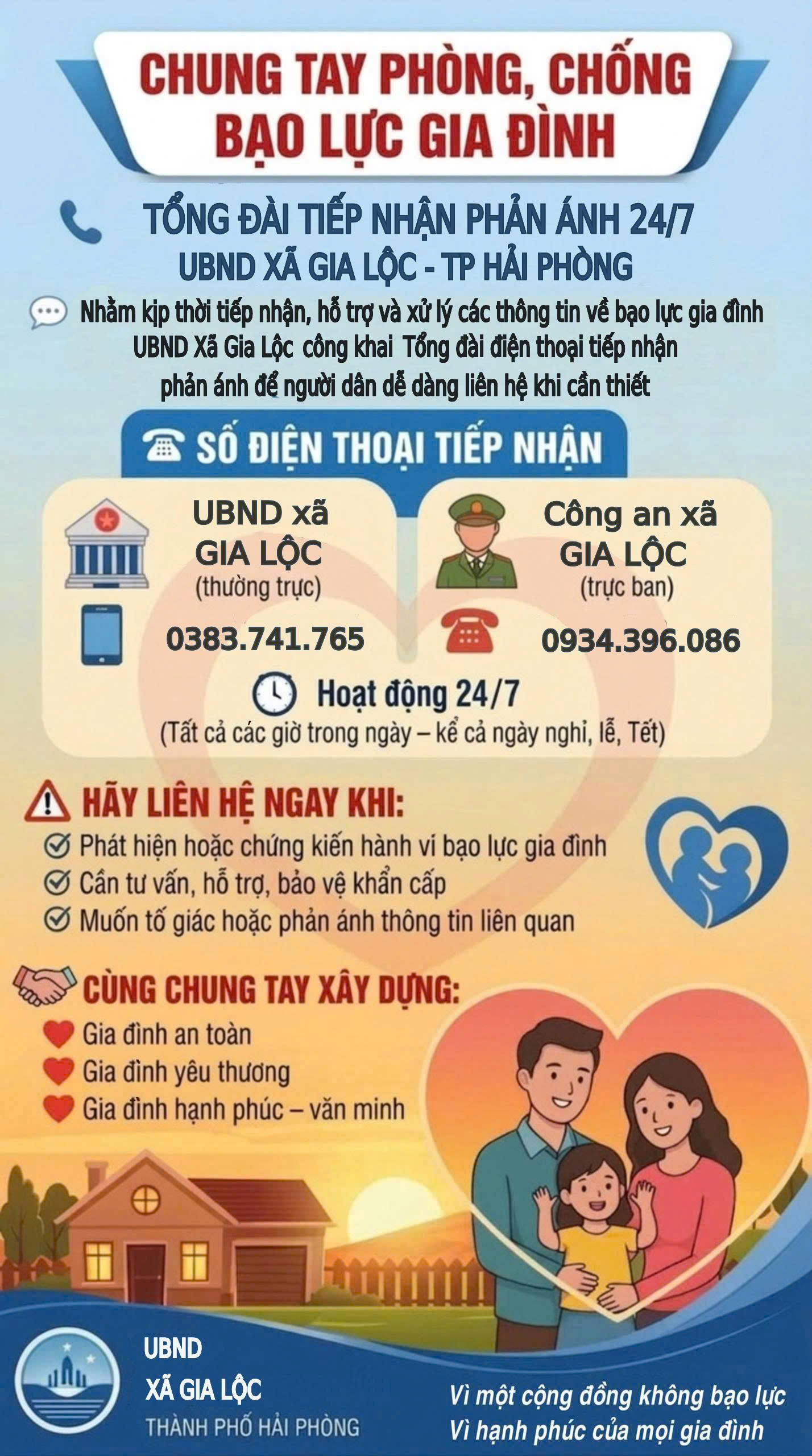 Thông báo công khai Tổng đài điện thoại về phòng, chống bạo lực gia đình của UBND xã Gia Lộc