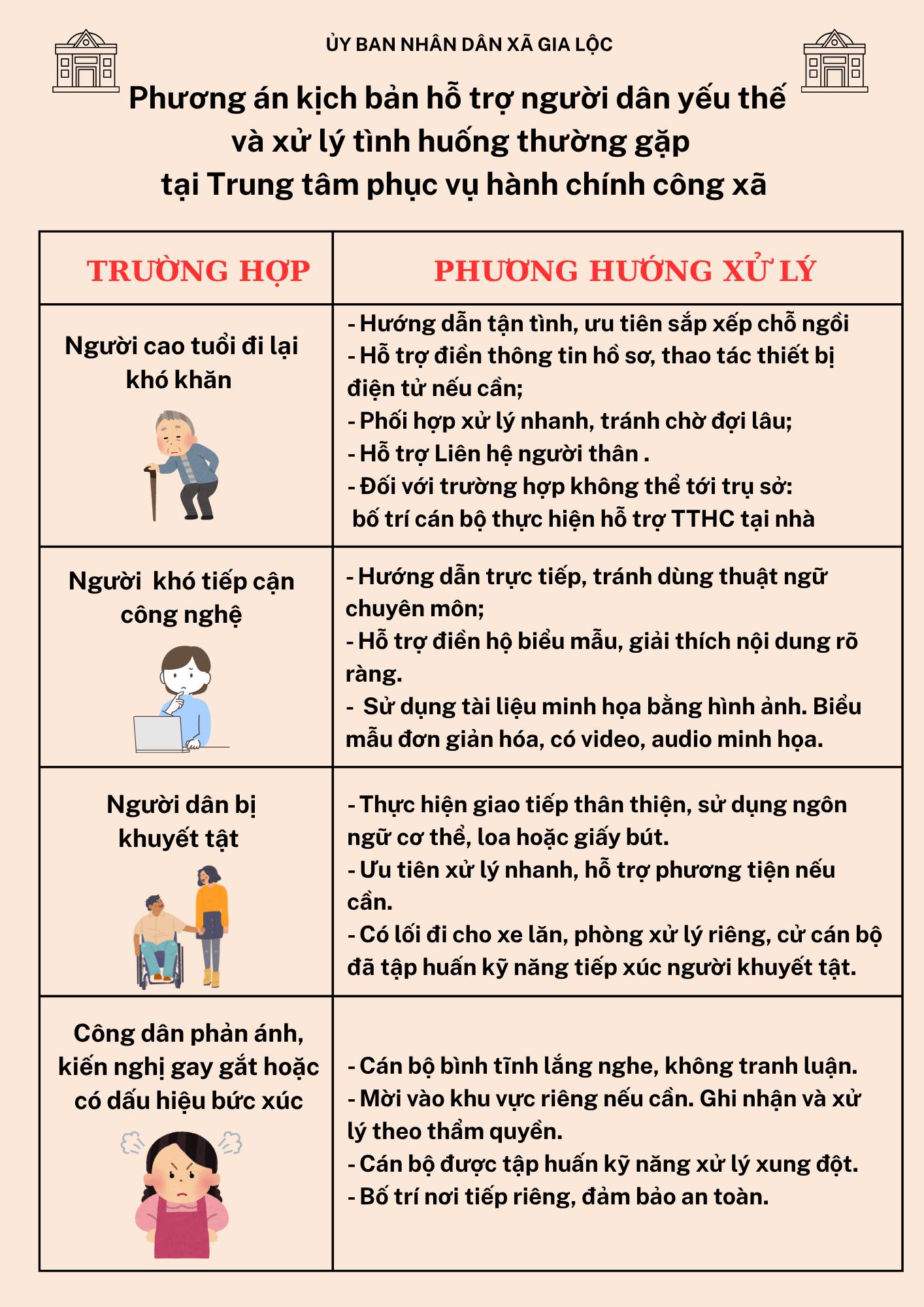 Về kịch bản và phương án hỗ trợ, thứ nhất, với trường hợp người cao tuổi đi lại khó khăn đến Trung tâm Phục vụ hành chính công xã giải quyết thủ tục hành chính. Thực hiện kịch bản xử lý sau: Hướng dẫn tận tình, ưu tiên sắp xếp chỗ ngồi thuận tiện; Hỗ trợ điền thông tin hồ sơ, thao tác thiết bị điện tử nếu cần; Phối hợp xử lý nhanh, tránh chờ đợi lâu; Hỗ trợ bố trí ghế ngồi chờ, nước uống, bảng thông tin dễ đọc; Liên hệ người thân hỗ trợ nếu cần. Đối với trường hợp không thể tới trụ sở, bố trí cán bộ thực hiện hỗ trợ thủ tục hành chính tại nhà.