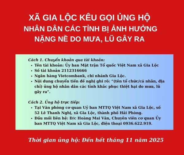 Đầu mối liên hệ: đ/c Hoàng Mai Văn, Chuyên viên cơ quan Ủy ban MTTQ Việt Nam xã Gia Lộc, điện thoại 0936.622.919.