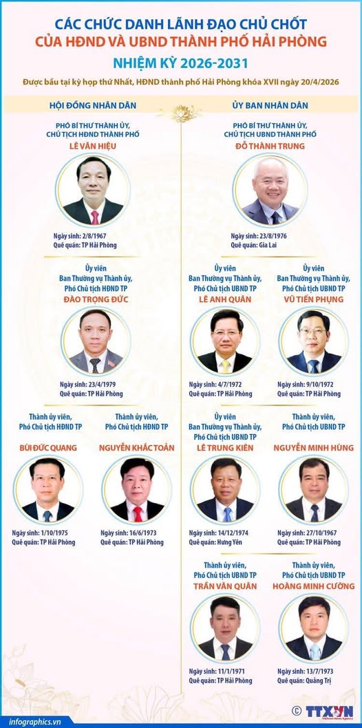 Các chức danh lãnh đạo chủ chốt của thành phố Hải Phòng nhiệm kỳ 2026-2031